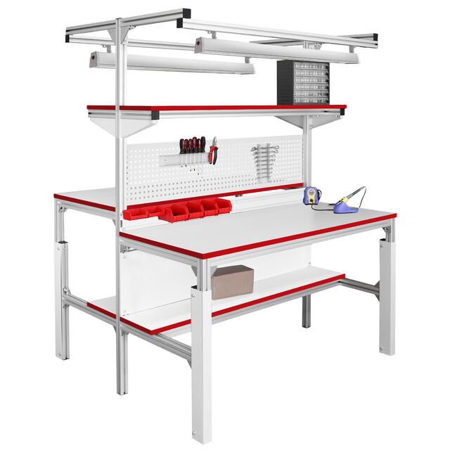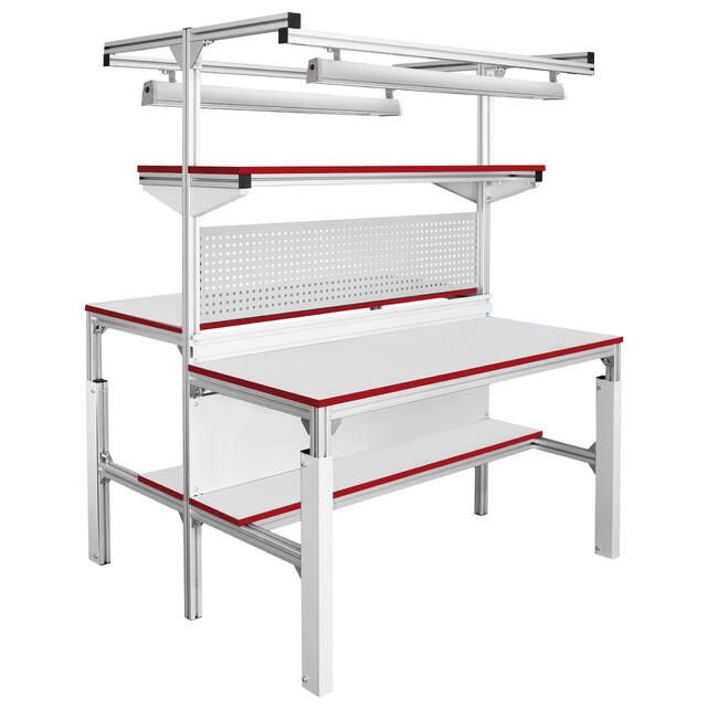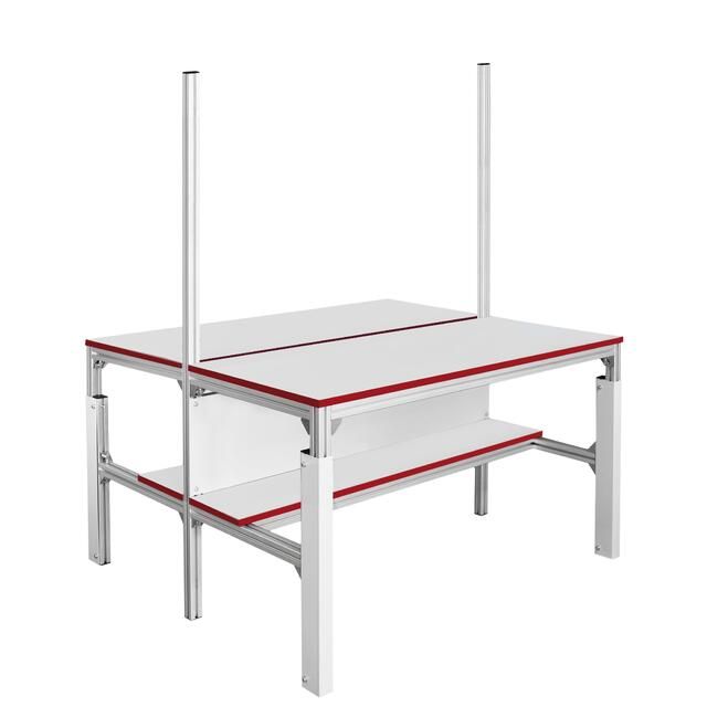Каркас стола изготовлен из конструкционного профиля. Высота столешниц регулируется в пределах от 650 мм. до 950 мм. Распределенная нагрузка на стол — до 300 кг. Конструкция стола позволяет оснастить его дополнительным оборудованием и интегрировать с конвейерами, рольгангами.