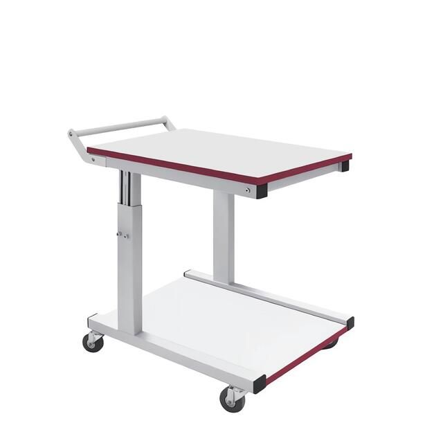 Стол оснащен четырьмя колесными опорами, две из которых с механизмом фиксации. Столешница толщиной 25 мм. изготовлена из ламинированного ДСП. Износостойкое покрытие из промышленного пластика обладает высокой стойкостью к термическим и механическим нагрузкам. Цвет боковой кромки стола — бордовый.