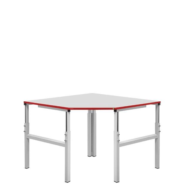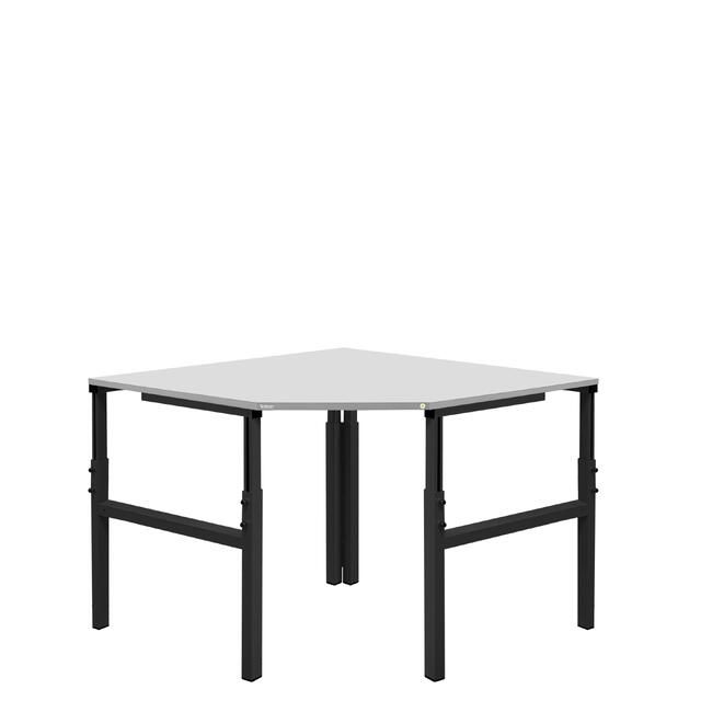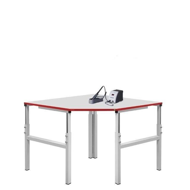 Металлический каркас стола выполнен из П-образного профиля, покрытого износостойкой порошковой краской светло-серого цвета RAL7035. Высота столешницы регулируется в пределах от 650 мм до 950 мм. Распределенная нагрузка на стол — до 300 кг. Столешница изготовлена из ламинированного ДСП толщиной 25 мм.