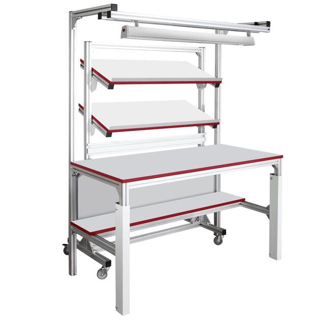 Каркас стола и стойки изготовлены из конструкционного профиля. Высота столешницы регулируется в пределах от 750 мм до 950 мм, что позволяет работать сидя и стоя. Распределенная нагрузка на стол — до 300 кг. Конструкция стола позволяет оснастить его дополнительным оборудованием и интегрировать с конвейерами, рольгангами и другими конструкциями и системами.