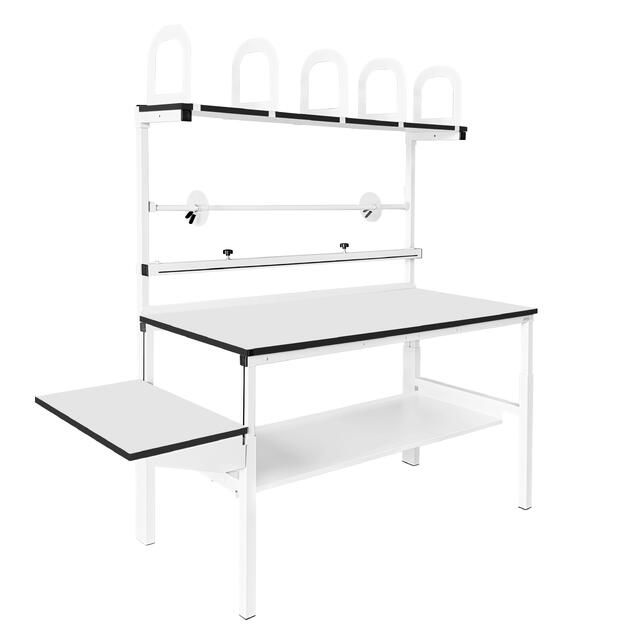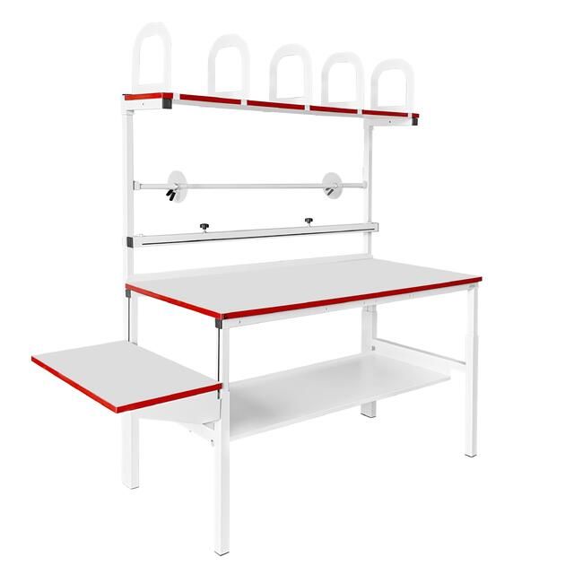 Функциональное расширение комплекта стола для упаковки КСР осуществляется с помощью дополнительного оснащения, начиная от типов покрытий столешницы, ограничителей, дополнительных держателей для рулонов (ДРВ, ДРБ), различных ящиков, заканчивая комплектом светодиодного освещения КОС.