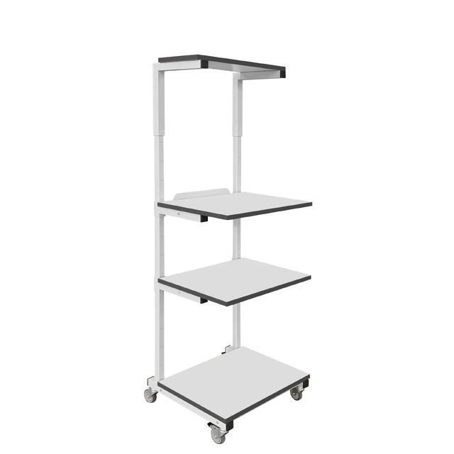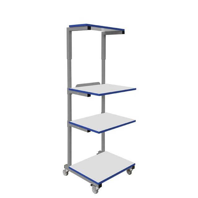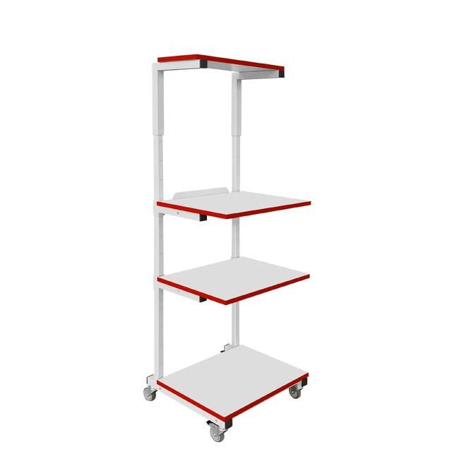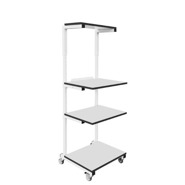Каркас стойки выполнен из П-образного профиля, покрытого износостойкой порошковой краской светло-серого цвета RAL7035. Высота полок регулируется. Распределенная нагрузка на стойку — до 150 кг. Конструкция подкатной стойки позволяет оснастить ее электропанелью.