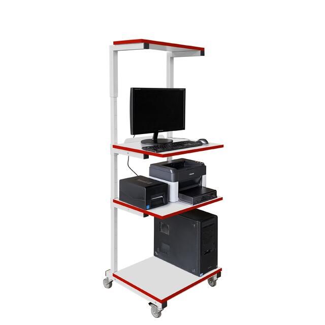 Стойка оснащена четырьмя колесными опорами, две из которых с механизмом фиксации. Полки толщиной 25 мм изготовлены из ламинированного ДСП. Износостойкое покрытие из промышленного пластика обладает высокой стойкостью к термическим и механическим нагрузкам. Цвет боковой кромки полок — фирменный бордовый.