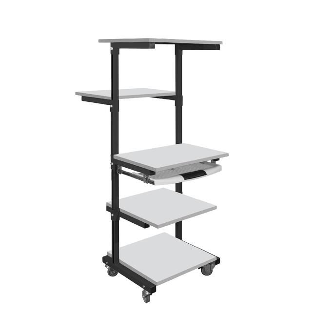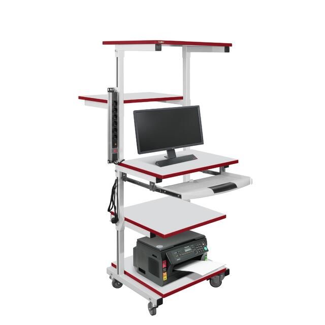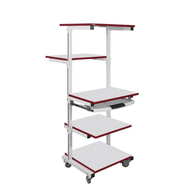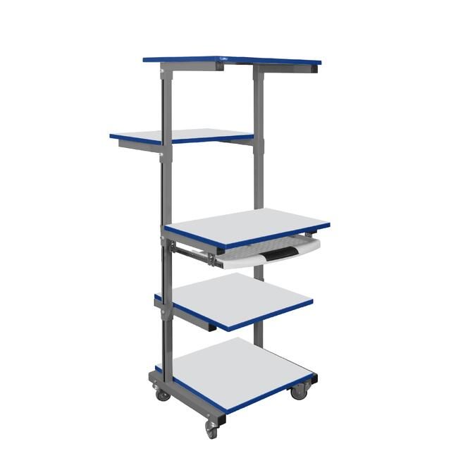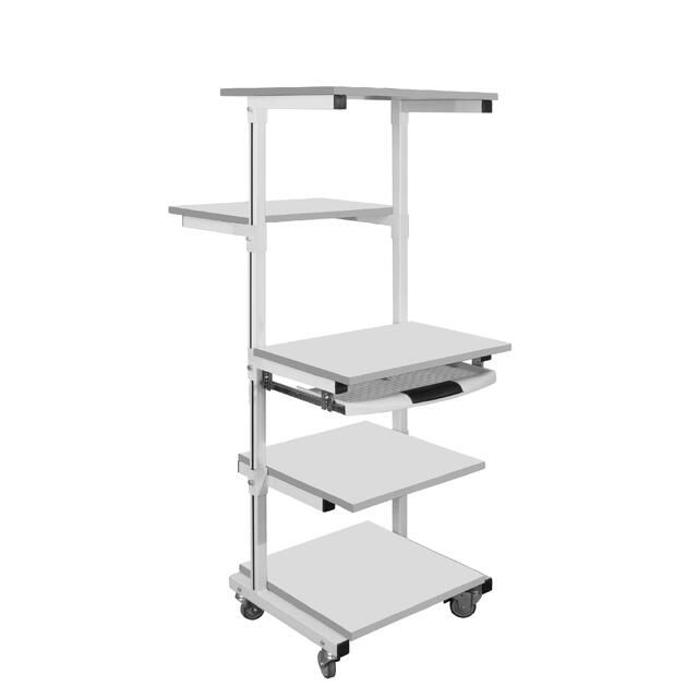 Стойка подкатная для оборудования СМО оснащена пятью полками, раздельно регулируемыми по высоте. Высота стойки — 1650 мм.