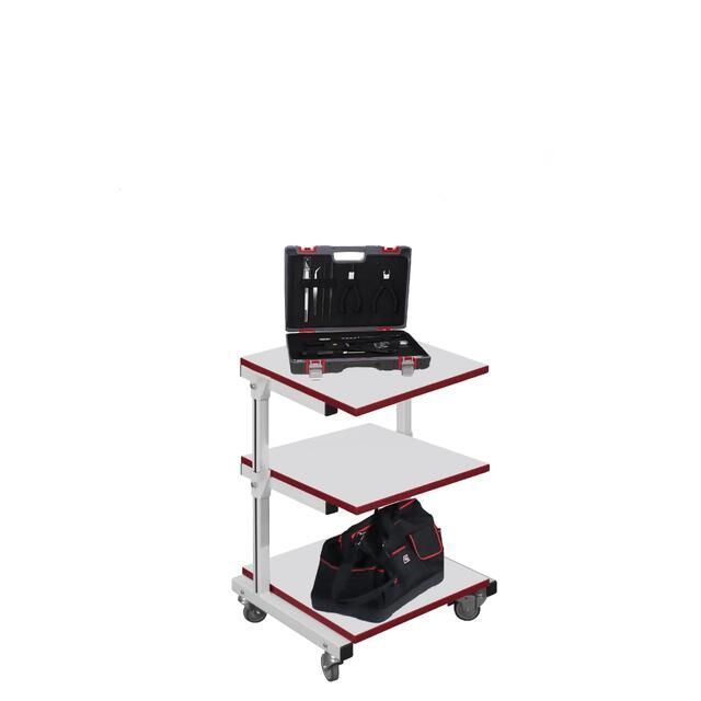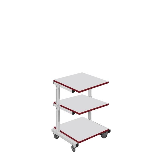 Стойка оснащена четырьмя колесными опорами, две из которых с механизмом фиксации. Полки толщиной 25 мм изготовлены из ламинированного ДСП. Износостойкое покрытие из промышленного пластика обладает высокой стойкостью к термическим и механическим нагрузкам. Цвет боковой кромки полки — фирменный бордовый; под заказ — любой другой на Ваш выбор.