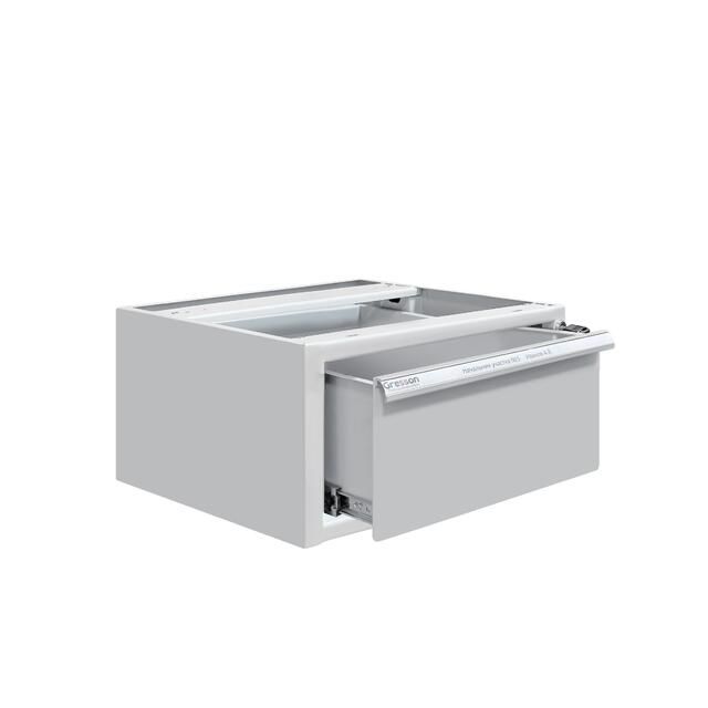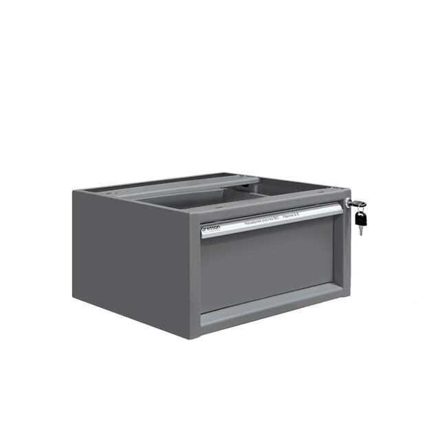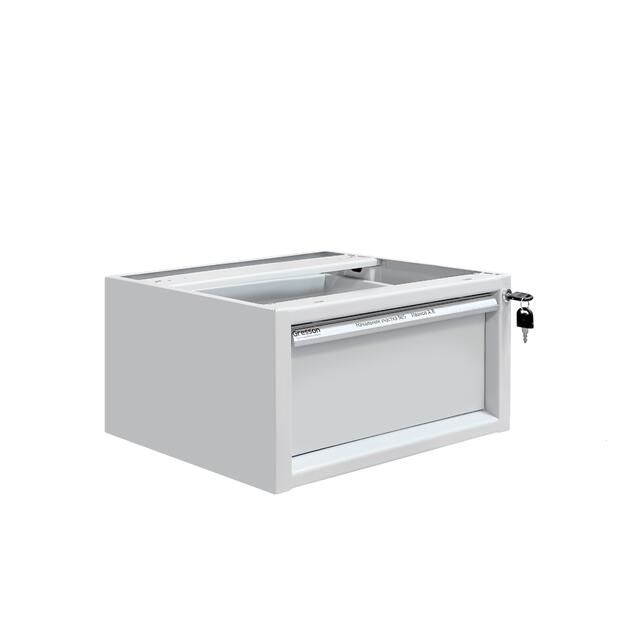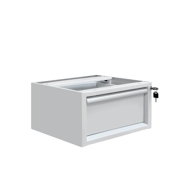 Каркас тумбы и ящик изготовлен из листового металла толщиной 1 мм, покрытого износостойкой порошковой краской светло-серого цвета RAL7035 с высокой стойкостью к химическим, термическим и механическим нагрузкам. Выдвижной ящик на телескопических направляющих. Распределенная нагрузка на ящик — до 30 кг.