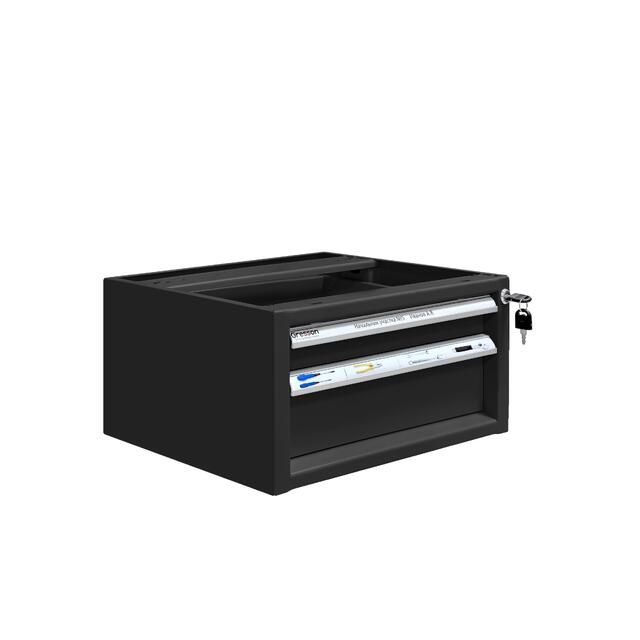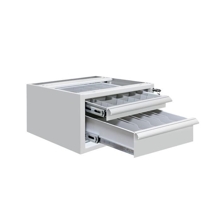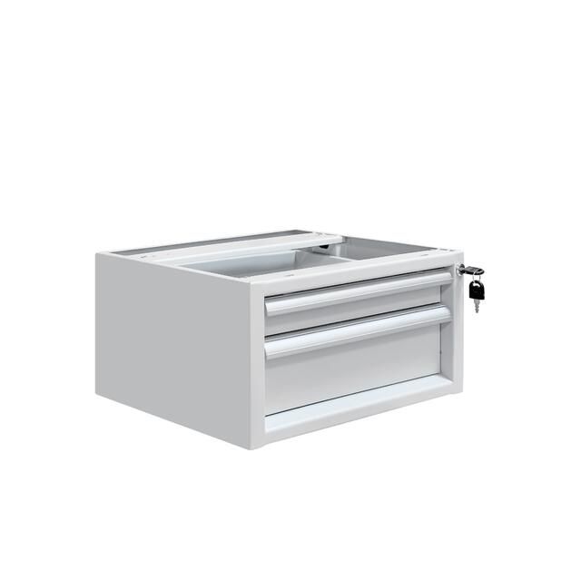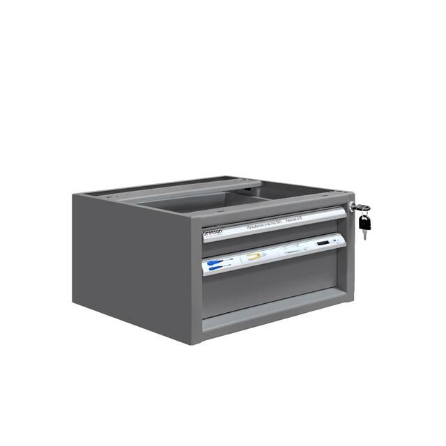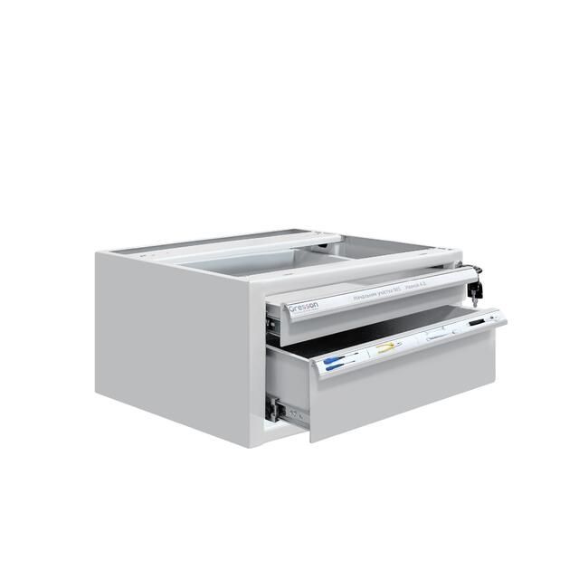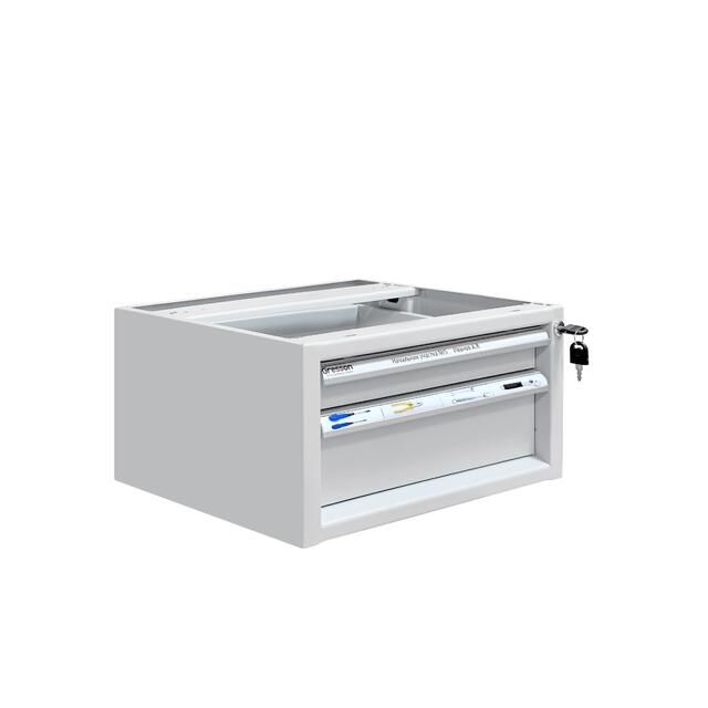 Каркас тумбы и ящики изготовлены из листового металла толщиной 1 мм, покрытого износостойкой порошковой краской светло-серого цвета RAL7035 с высокой стойкостью к химическим, термическим и механическим нагрузкам. Два выдвижных ящика на телескопических направляющих. Распределенная нагрузка на ящик — 30 кг.