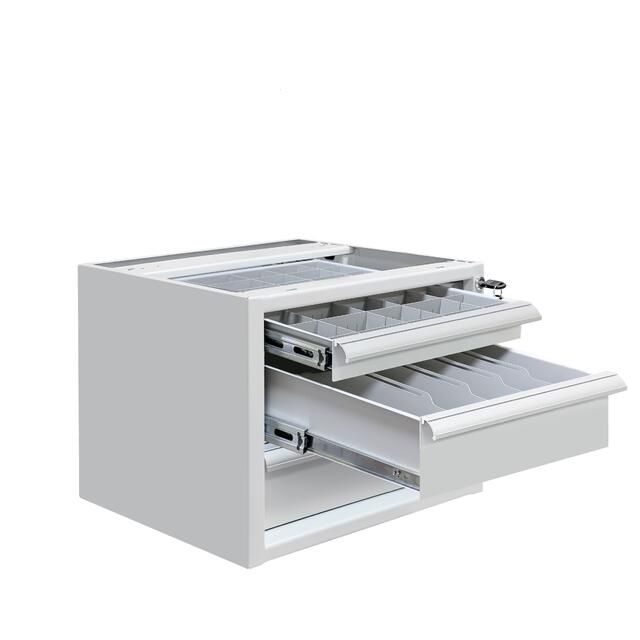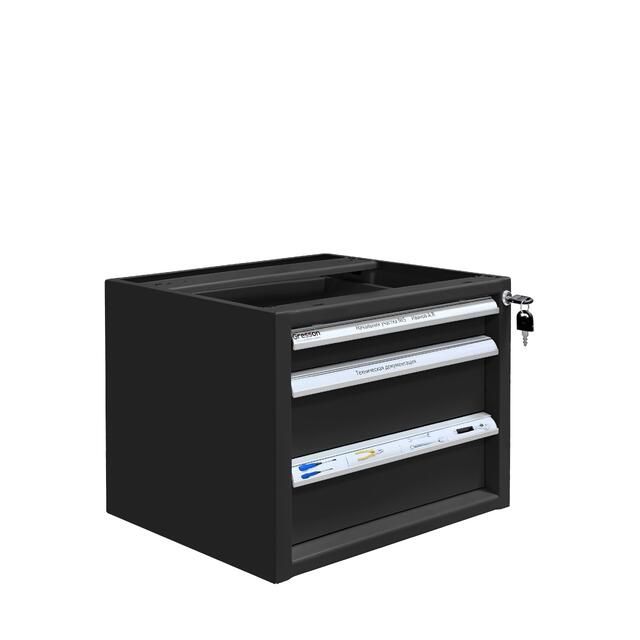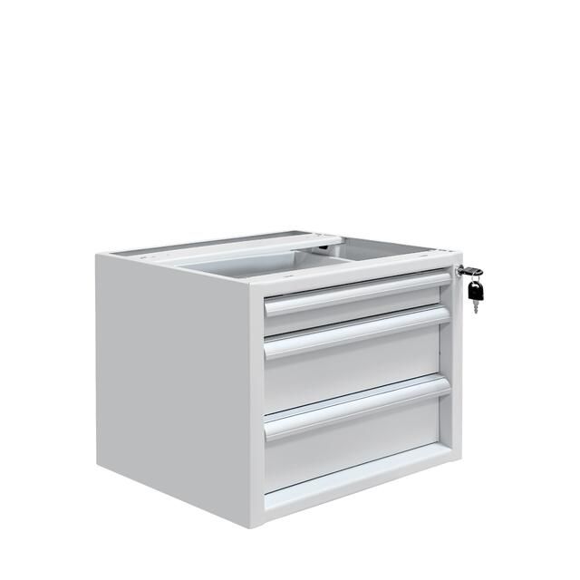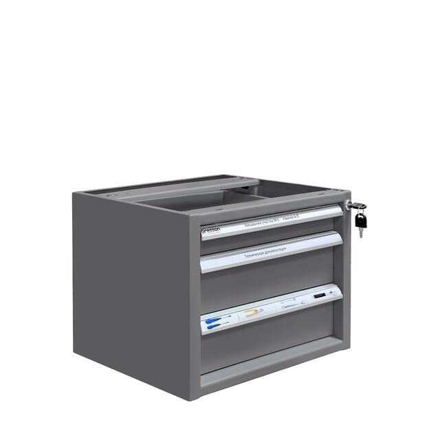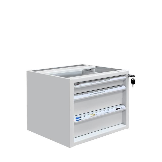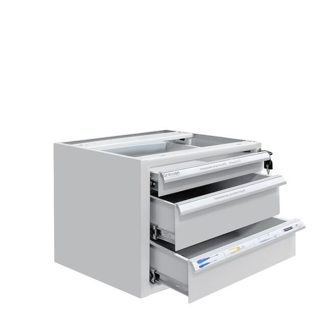 Каркас тумбы и ящики изготовлены из листового металла толщиной 1 мм, покрытого износостойкой порошковой краской светло-серого цвета RAL7035 с высокой стойкостью к химическим, термическим и механическим нагрузкам. Три выдвижных ящика на телескопических направляющих. Распределенная нагрузка на ящик — 30 кг.