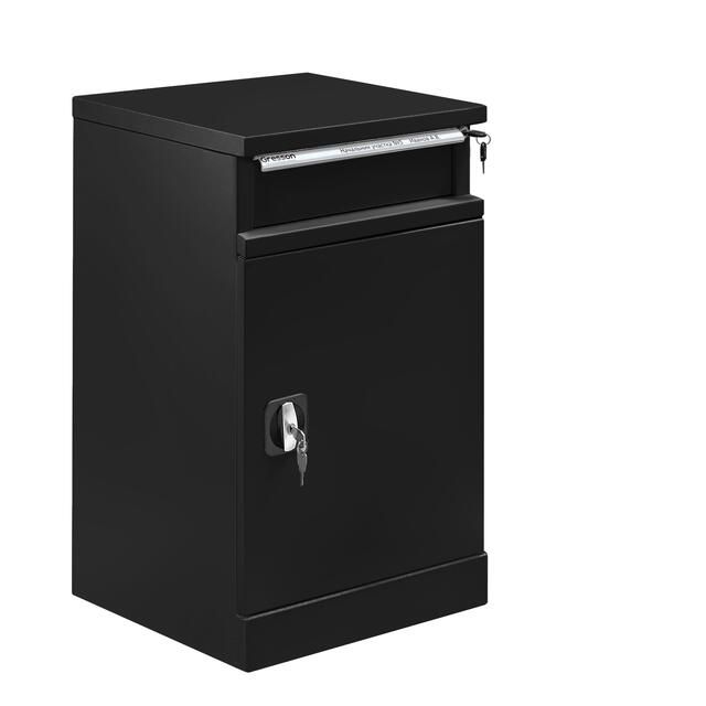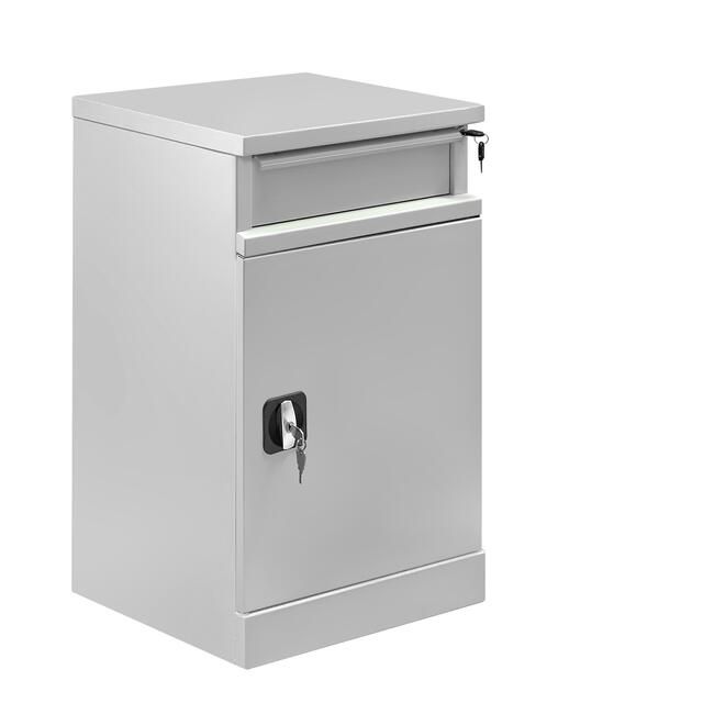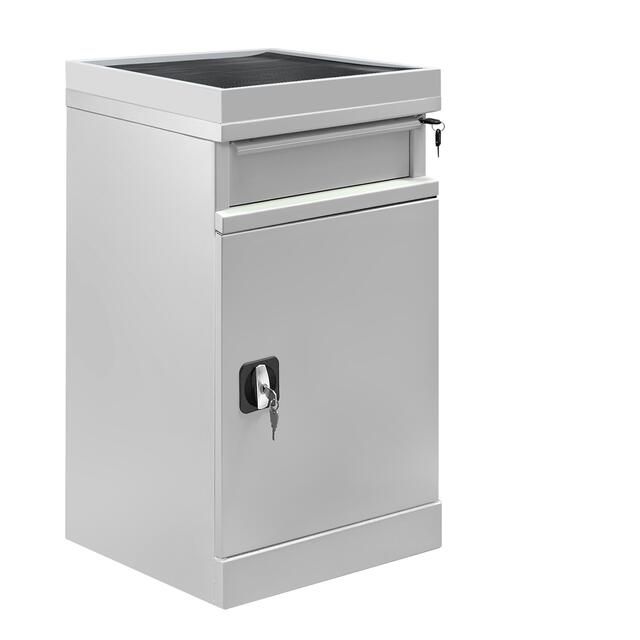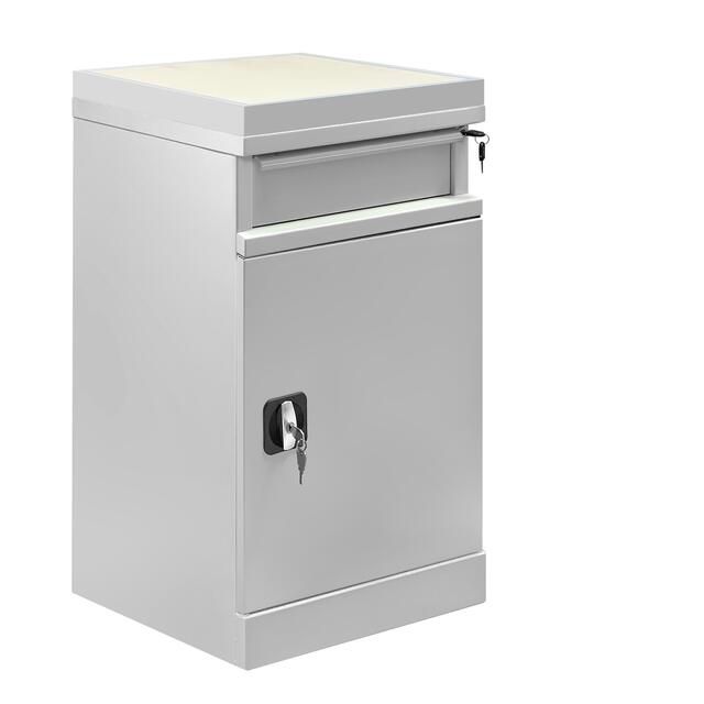 Металлическая тумба ТC-2 оборудована ригельным замком с ручкой и поставляется в комплекте с 2 ключами. Ящик тумбы имеет замок для индивидуального доступа. Корпус и полка изготовлены из листового металла для увеличения эксплуатационного ресурса и повышения надежности.