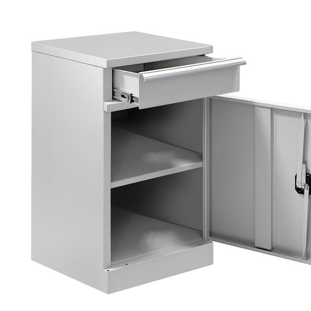 Тумба металлическая может быть использована для работы и организации хранения материалов как в составе рабочих мест, так и в виде отдельно используемой единицы. Внутреннее пространство тумбы, разделенное с помощью полки на две части, позволяет организовать хранение крупных материалов и инструментов.