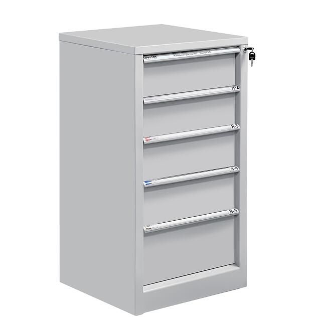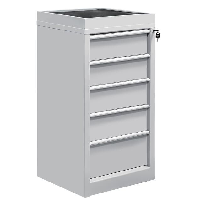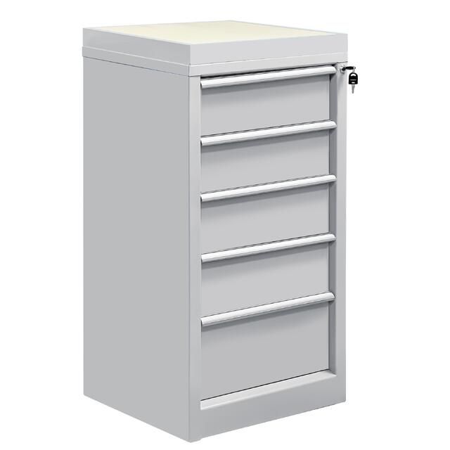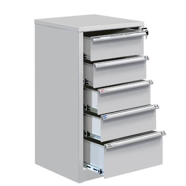 Каркас и ящики металлической тумбы изготовлены из листового металла толщиной 1 мм, покрытого износостойкой порошковой краской светло-серого цвета RAL7035 с высокой стойкостью к химическим, термическим и механическим нагрузкам. Пять выдвижных ящиков на телескопических направляющих.