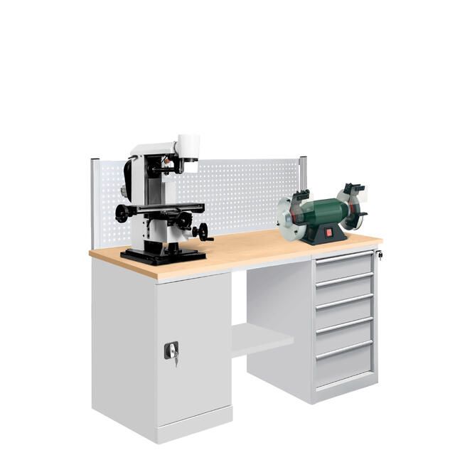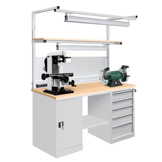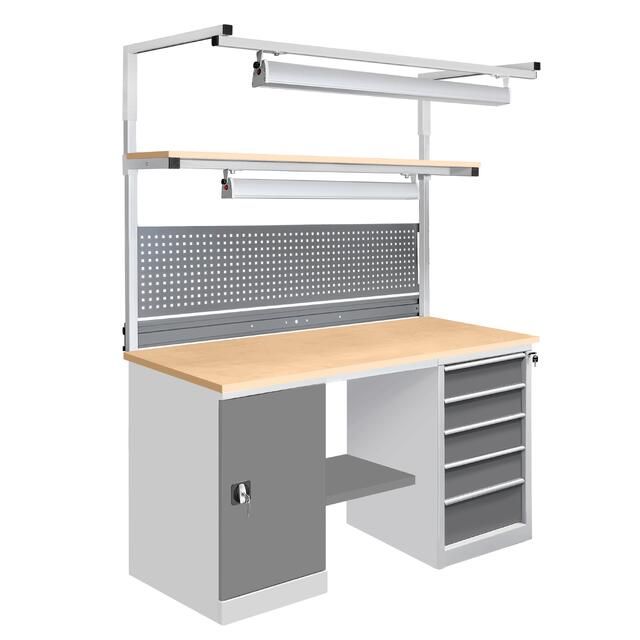 На тумбах установлен центральный и ригельный замок для индивидуального доступа. Ручки ящиков тумбы ТС-5 изготовлены из алюминиевого профиля с анодированным покрытием и боковыми пазами для установки обозначения (маркировки) ящиков по их прямому назначению (подразделение организации, документация, инструменты, материалы и т.д.). В зависимости от габаритов используемых инструментов, материалов и оснастки возможно подобрать тумбу верстака с разным количеством ящиков. Нижняя полка верстака изготовлена из металла для устойчивого положения верстака и позволяет организовать хранение материалов.