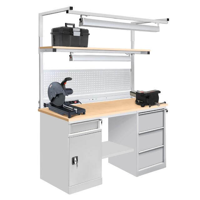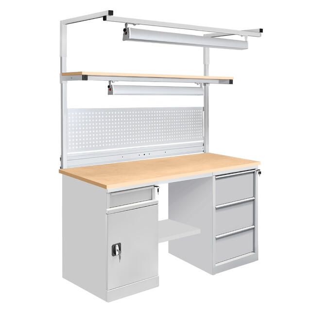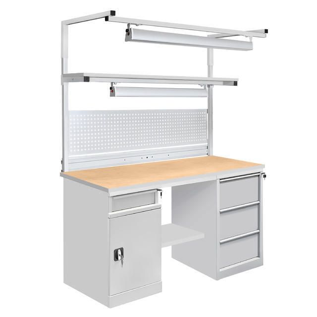 На тумбах установлен центральный и ригельный замок для индивидуального доступа. Ручки ящиков тумбы ТС-2 и ТС-3 изготовлены из алюминиевого профиля с анодированным покрытием и боковыми пазами для установки обозначения (маркировки) ящиков по их прямому назначению (подразделение организации, документация, инструменты, материалы и т.д.). В зависимости от габаритов используемых инструментов, материалов и оснастки возможно подобрать тумбу верстака с разным количеством ящиков. Нижняя полка верстака изготовлена из металла для устойчивого положения верстака и позволяет организовать хранение материалов.